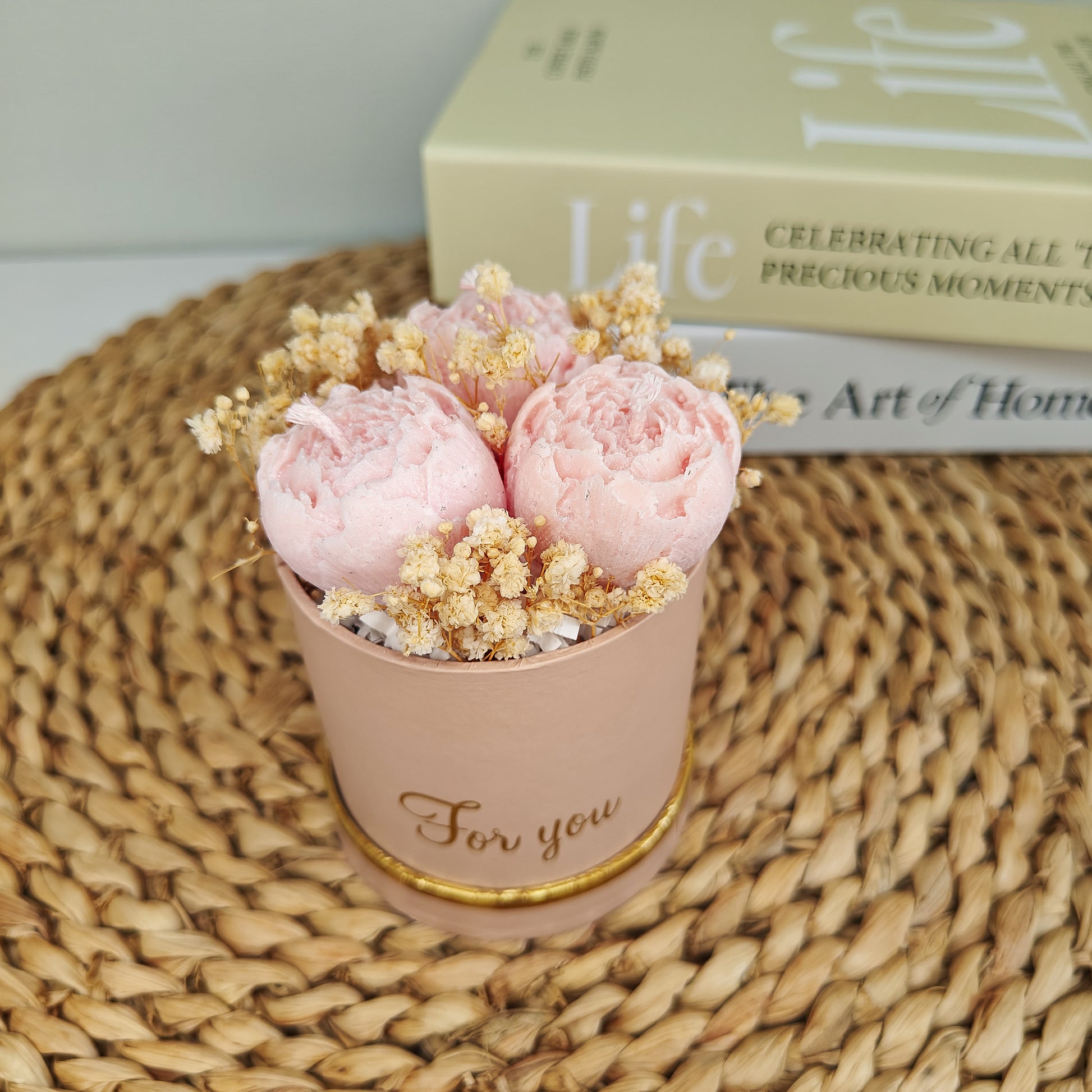 See minimalistlik küünlakimp kolme õrnroosa pojengiõiega on küll väga tagasihoidlik, kuid samas kaunilt elegantne - detail, mis toob ruumi soojust ja romantilist meeleolu ning meeldivalt õrna aroomi.