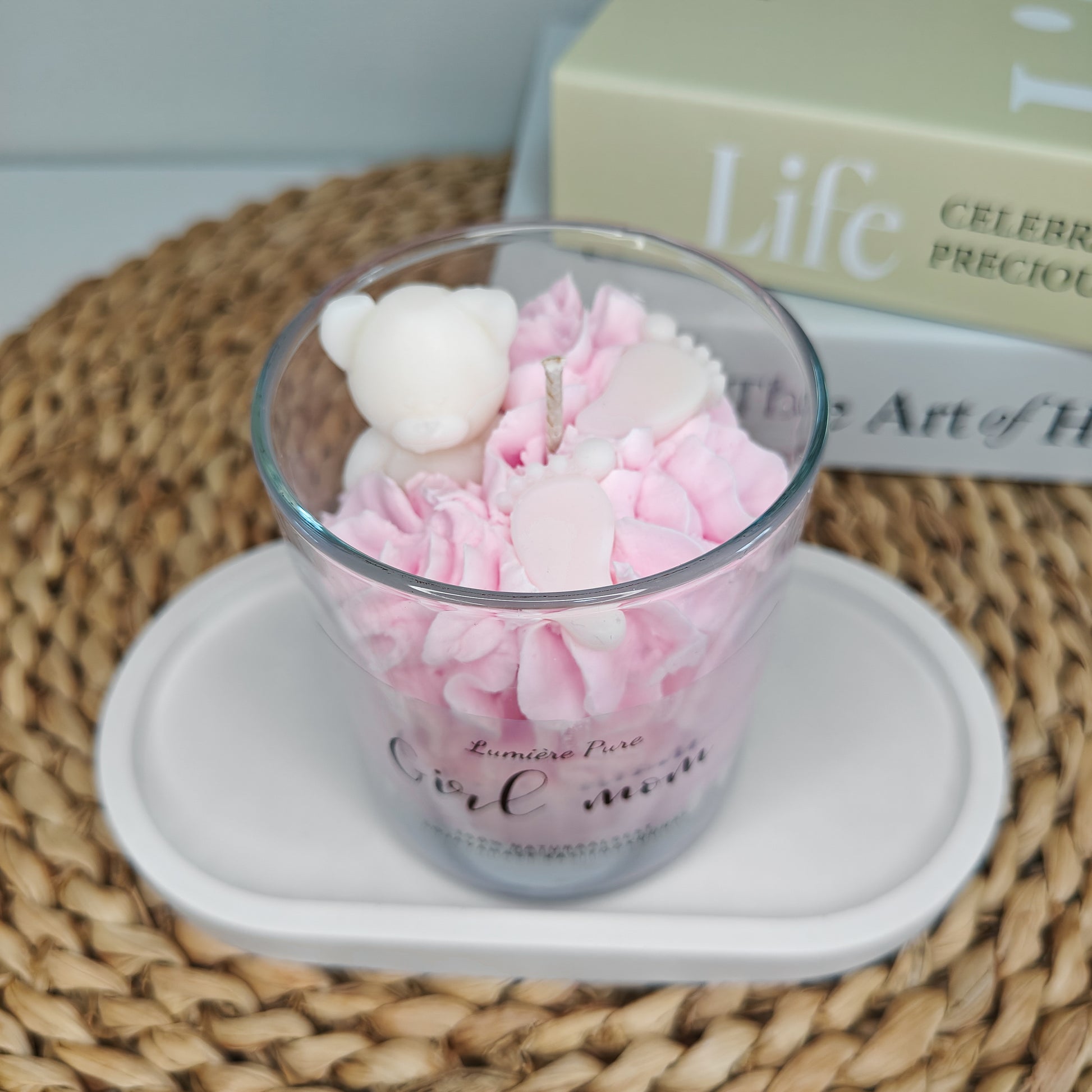 See õrn beebiroosa küünal mõmmiga on lõhnatu ja 100% naturaalne, mõeldes värskele emale ja beebile.