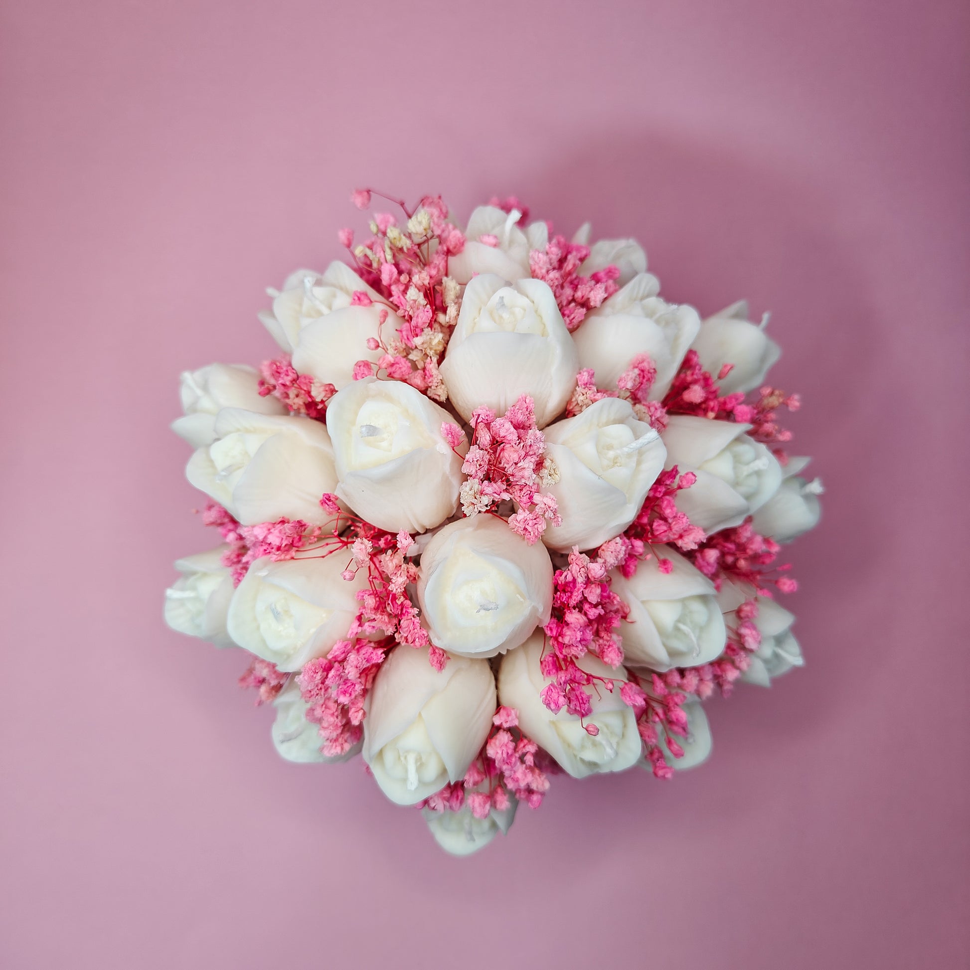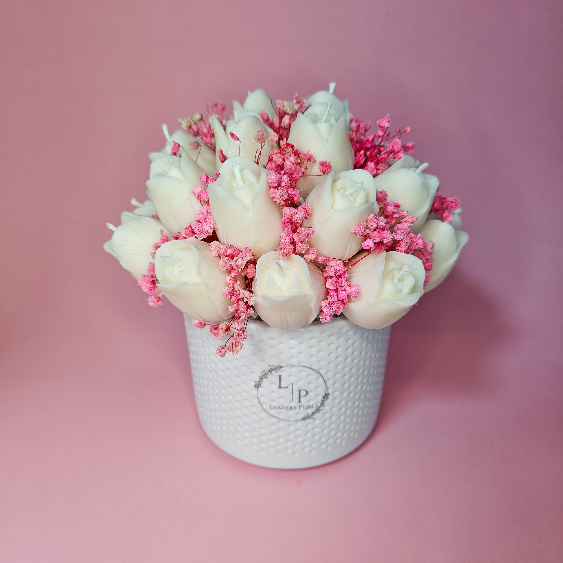 Naudi hetke, mil valgus ja ilu põimuvad. "Blushing Tulips" koosneb 24 valgest pojengiõiest, mis täidavad ruumi pehmuse ja romantikaga. Iga detail on valminud hoole ja armastusega, et tuua Sinu koju ilu ja soojust.